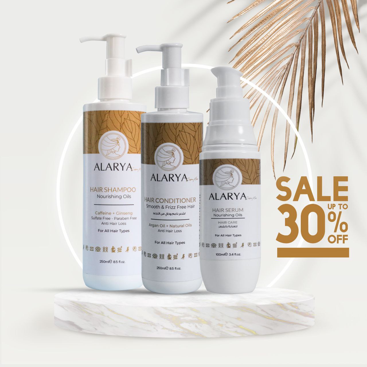 استعيدي حيوية شعرك مع مجموعة ألاريا (Alarya) المبتكرة بتقنية النانو. نظام ثلاثي متكامل (شامبو، بلسم، وسيروم) لعلاج التساقط، ترميم التلف، وحماية شعرك من الحرارة. احصلي على مظهر حرير ونتائج احترافية في منزلك بخصم 30% على المجموعة